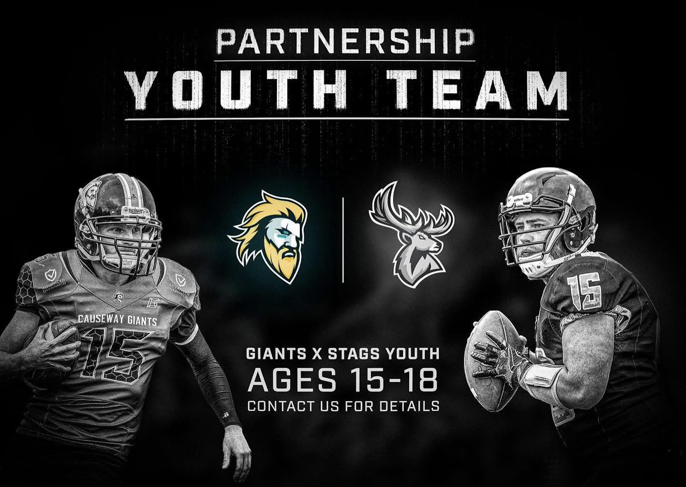 We’re proud to announce a youth partnership between the Causeway Giants and the County Antrim Stags to develop an exciting new youth American football team in County Antrim! Open to ages 15–18 — this is your chance to get involved, build skills, and be part of something special. Get in touch with us through our Facebook page to register your child’s interest, we can’t wait to see the next generation take the field!